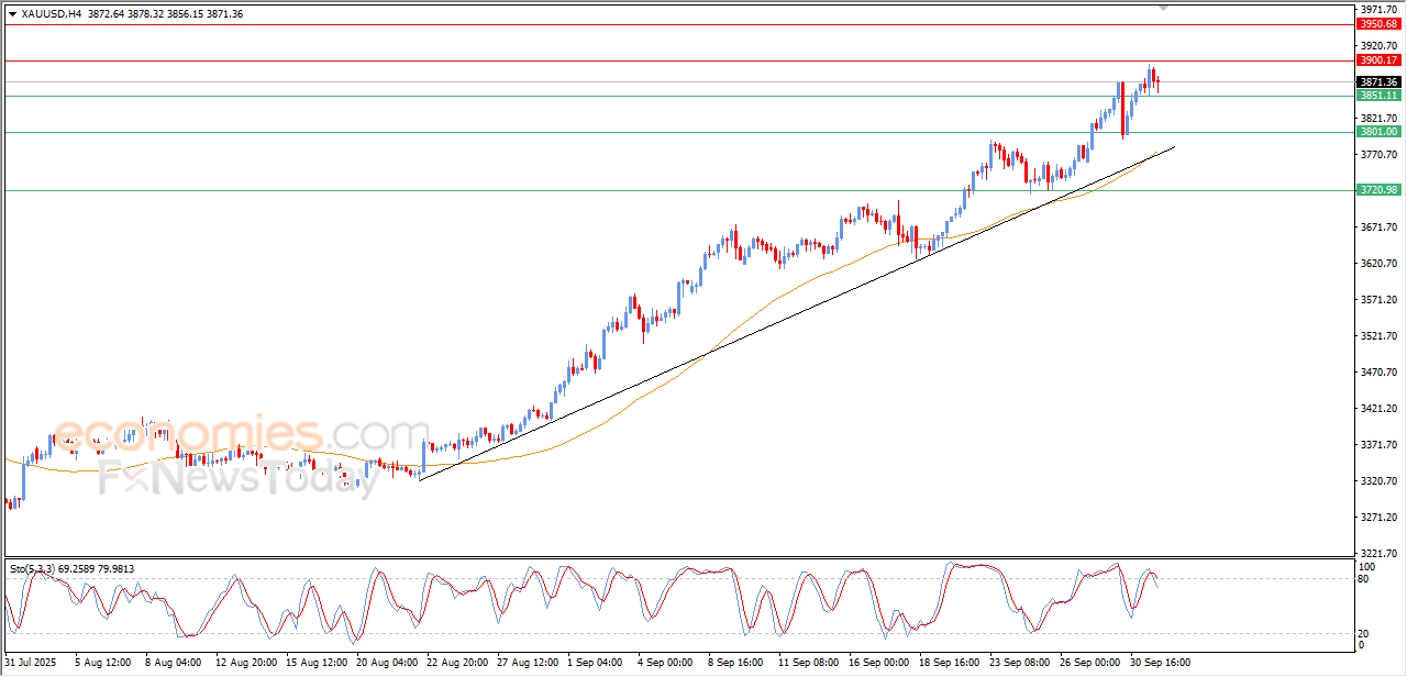 Cena (złota) spadła podczas ostatnich notowań wewnątrzsesyjnych, po tym jak po raz pierwszy w historii zbliżyła się do oporu na poziomie 3900 USD, aby zgromadzić zyski z poprzednich wzrostów i spróbować uzyskać pozytywny impet, który mógłby pomóc jej się odbić i ponownie wzrosnąć, próbując zrekompensować część wyraźnych warunków wykupienia wskaźnikami siły względnej, szczególnie w obliczu pojawienia się negatywnych sygnałów z tego miejsca, pośród dominacji głównego trendu wzrostowego w krótkim terminie i notowań wzdłuż linii trendu.