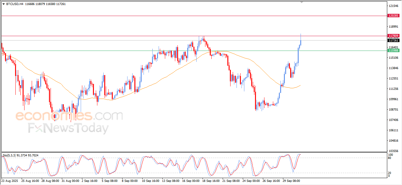 Cena (BTCUSD) kontynuowała wzrost w ostatnich notowaniach wewnątrz dnia, osiągając nasz ostatni oczekiwany cel na poziomie krytycznego oporu na poziomie 117 800 USD, pośród dominacji stromej byczej podfali, co wskazuje na siłę i dominację tego trendu, pośród pojawienia się pozytywnych sygnałów na wskaźnikach siły względnej, pomimo osiągnięcia poziomów wykupienia.